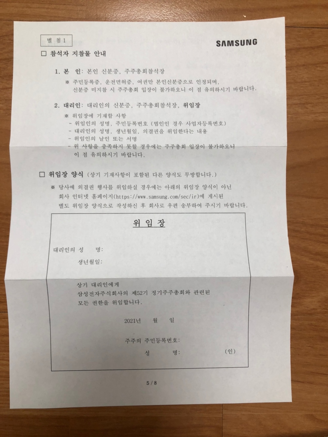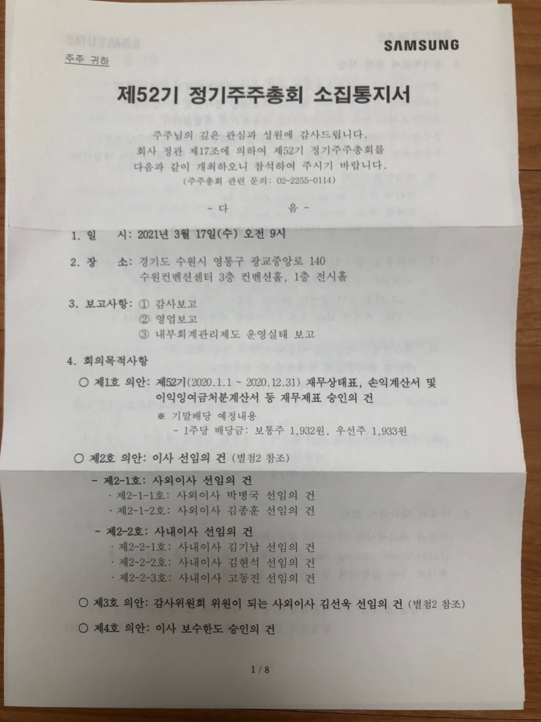 주주총회 소집통지서는 삼성전자 주식을 단 1개라도 가지고 있으면 다 오는 통지서라고 한다.