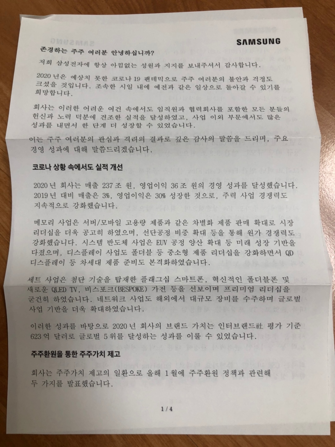 이렇게 위와 같이 주주들을 위한 편지(?) 도 있었다. 삼성전자 정말 코로나 시국에도 실적 개선도 되고 장기적으로 들고 있기 좋은 주식이라고 생각한다. 앞으로도 쭉 잘해주었으면 하는 바램이다.