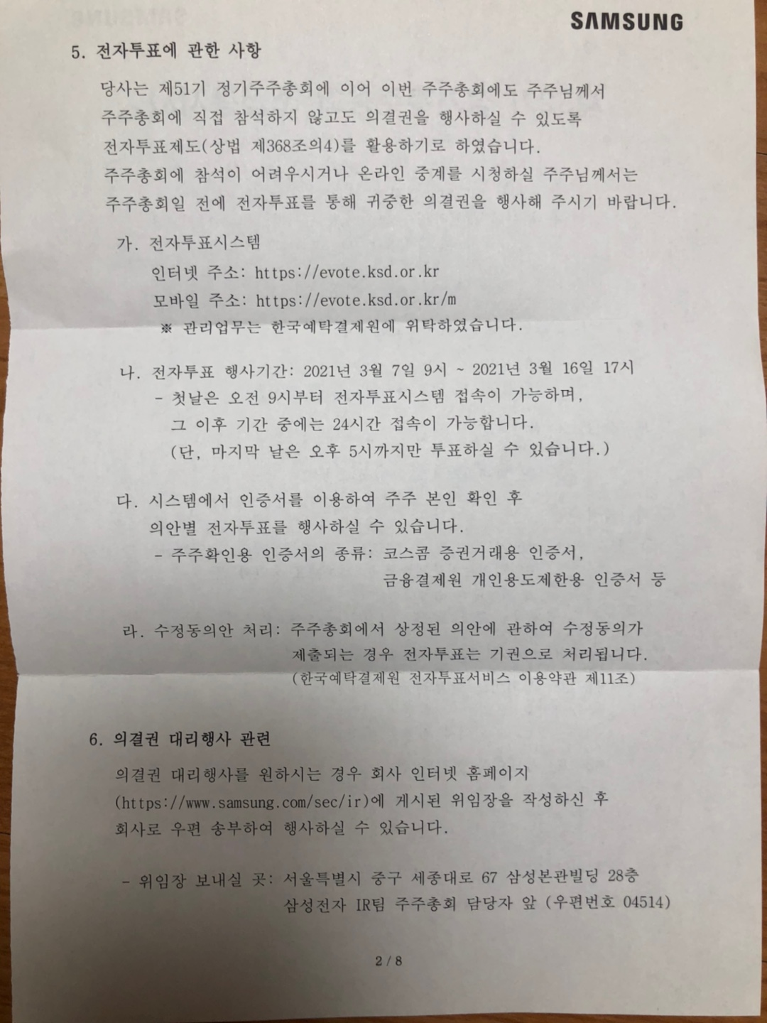 나는 삼성전자 주식 대주주는 아니지만 적당히 가지고 있는 주주다. 오늘은 삼성전자 주주총회 소집통지서가 온 날이다!