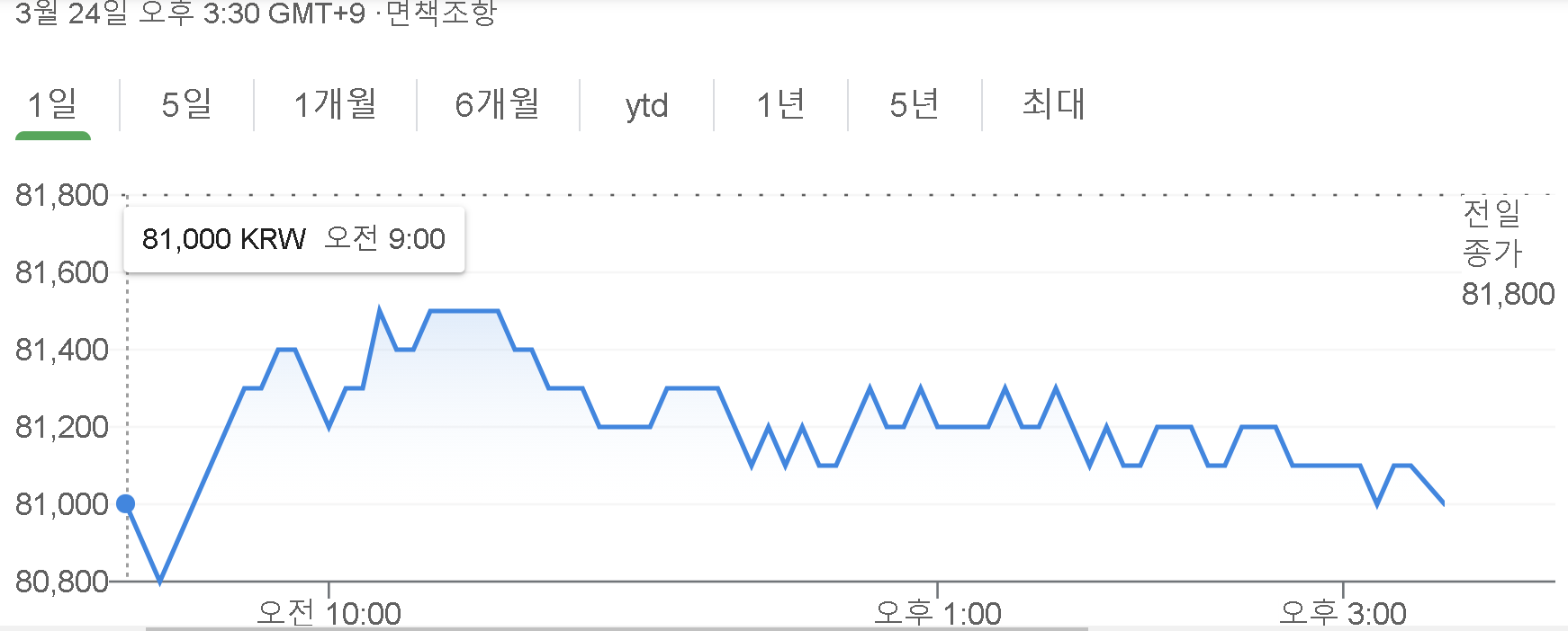 어제 기준 삼성전자 주가를 보면 많이 떨어진 것을 알 수 있다. 구글이나 네이버 모두 검색하면 바로 주가 추이를 알 수 있다. 삼성전자는 어제 아침부터 하락하기 시작했고 81,000원에 장을 마감했다. 내일은 어떻게 될지 지켜봐야겠다.