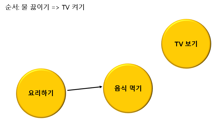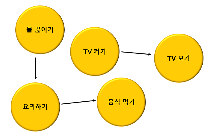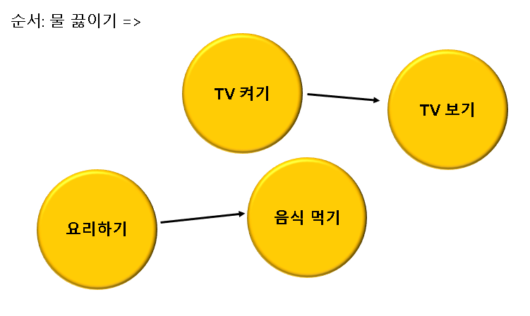 물 끓이기 => TV 켜기 => 요리하기 => TV 보기 => 음식 먹기