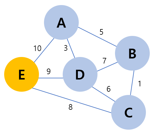 다음으로 가능한 간선은 8, 9, 10이고 그 중에서 가장 작은 weight가 8이므로 8 간선이 선택되고 E가 채택된다.