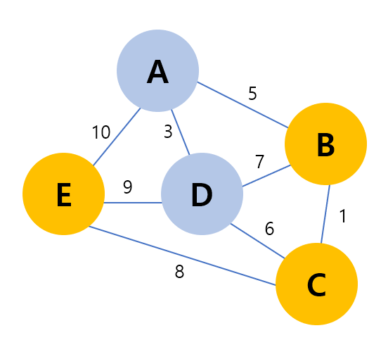 그러면 다음 정점으로 가능한 것은 선택이 되지 않은 정점 중 A, D와 연결된 정점이다. 5와 7의 간선으로 연결된 B, 10으로 연결된 A, 6으로 연결된 C 모두 가능하다. 이 중 간선의 최소값은 5이므로 B가 다음 정점으로 선택되는 것이다.