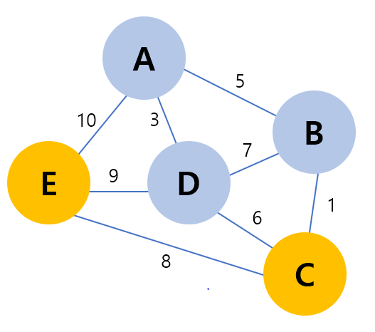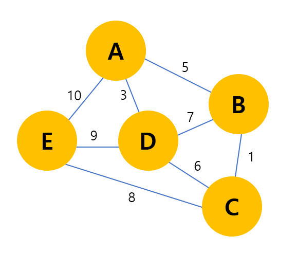 먼저 1번에 따라 아무 정점이나 선택해본다. 나는 A 정점을 선택해보겠다. 그러면 다음으로 선택될 수 있는 정점에는 A와 연결된 B, D, E 정점이 가능하다. 각각 간선의 비용을 살펴보면 5, 3, 10이므로 그 중에서 가장 작은 3의 비용으로 연결된 D를 선택한다.