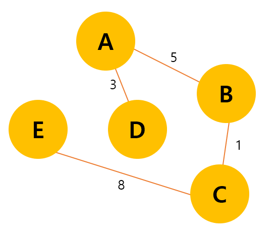 먼저 1번에 따라 아무 정점이나 선택해본다. 나는 A 정점을 선택해보겠다. 그러면 다음으로 선택될 수 있는 정점에는 A와 연결된 B, D, E 정점이 가능하다. 각각 간선의 비용을 살펴보면 5, 3, 10이므로 그 중에서 가장 작은 3의 비용으로 연결된 D를 선택한다.