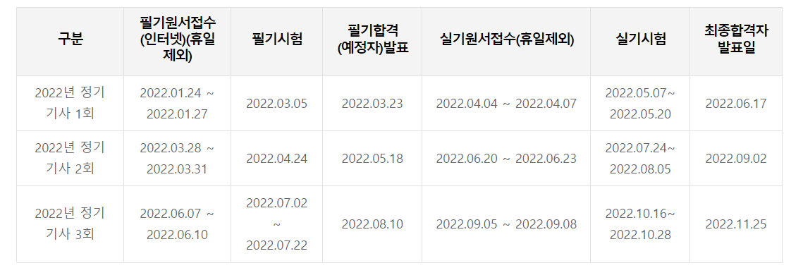 정보처리기사는 1년에 총 3번 실시되는 자격시험으로 필기시험과 실기시험을 모두 합격해야 한다. 만약 2022년 정기기사 1회 시험 원서 접수를 놓친 사람들은 2회와 3회 시험 원서접수를 까먹지 말고 해보자.